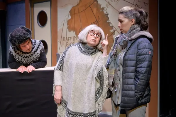 Steven Greenfield, Andrea House and Elena Porter in The Wrong People Have Money (Shadow Theatre). Directed by John Hudson. Set Design by Cindi Zuby. Costume Design by Leona Brausen. Lighting Design by Heather Cornick . Sound Design by Darrin Hagen. Photo by Marc J Chalifoux.
